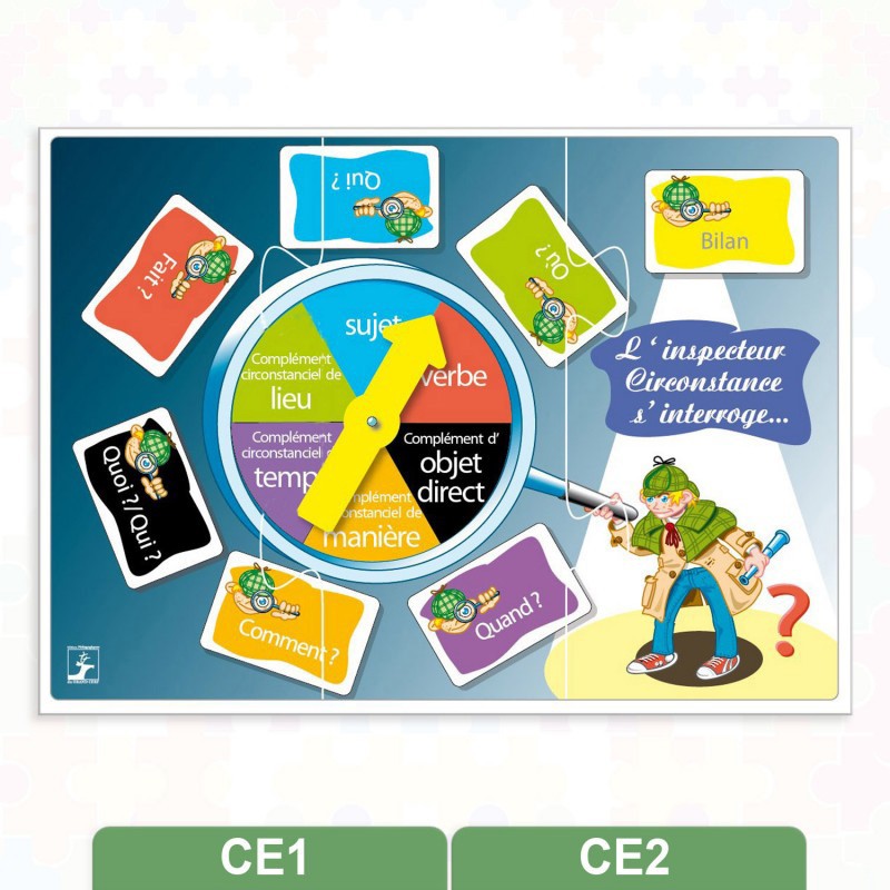 Le même protocole de jeu peut se faire avec la roue des circonstanciels, sans indication de couleurs. Les joueurs doivent dans ce cas retrouver la couleur des cartes correspondante, en se posant les bonnes questions. (ex : La flèche s’arrête sur la case «complément circonstanciel de temps» le jouer doit se poser la question «quand ?»).