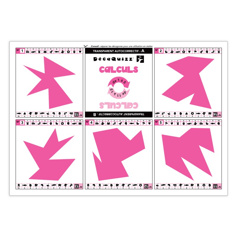 Utilisation en atelier : 10 élèves peuvent valider, en même temps, leurs feuilles de tracés A ou B, à l’aide des 10 décagones.