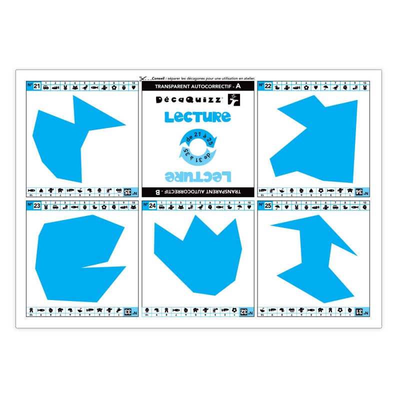 Utilisation en atelier : 10 élèves peuvent valider, en même temps, leurs feuilles de tracés A ou B, à l’aide des 10 décagones.