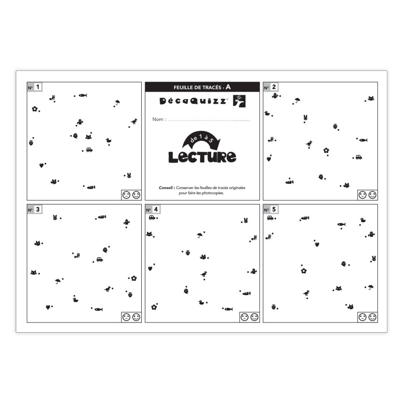 Pochette de 20 fiches exercices, soit 200 exercices, 2 fiches de tracés, 2 transparents autocorrectifs.