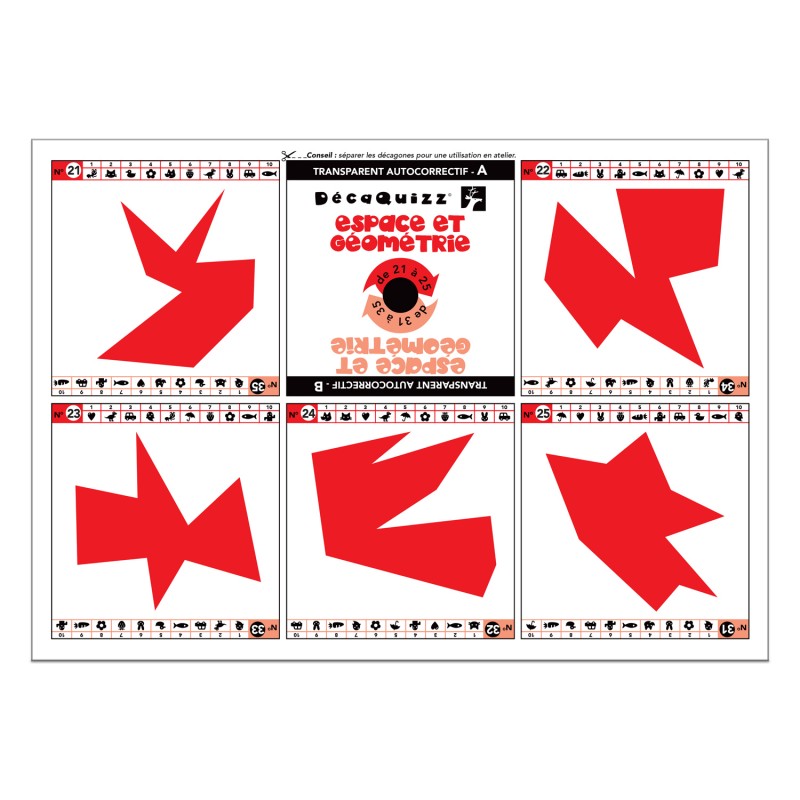 Autocorrection simple et rapide : vérifier par superposition si la forme du décagone correspond à celle du transparent autocorrectif. En cas d’erreur, le tableau de réponses présent sur le transparent aide à la correction.