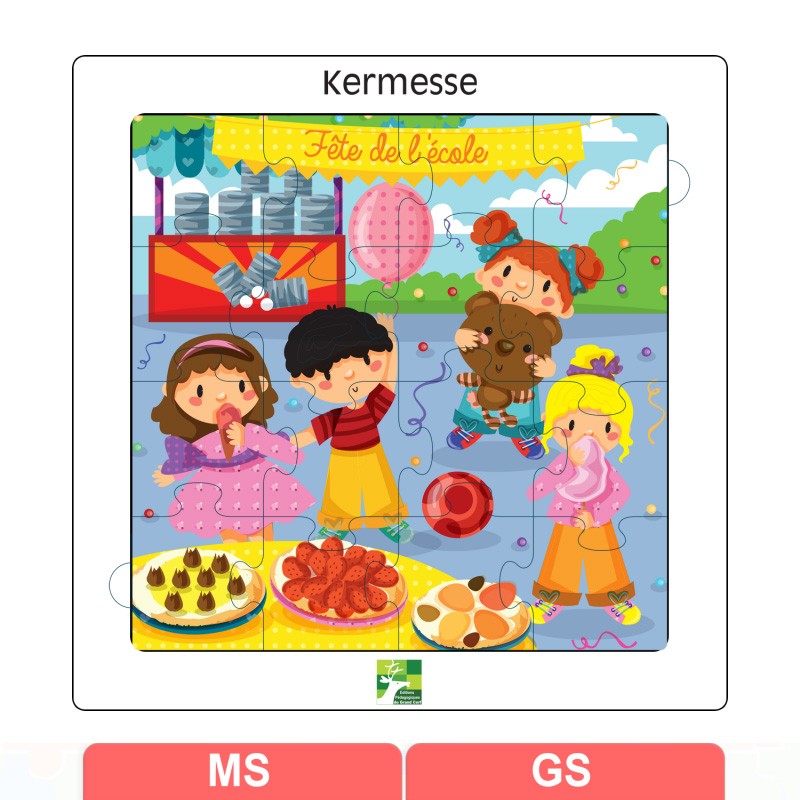 Ce puzzle de 16 pièces (220 x 220 mm) plonge les enfants dans l’univers coloré et festif de la kermesse. Conçu spécialement pour les petits dès 4 ans, il s’accompagne de 2 fiches consignes recto verso, proposant 4 niveaux de jeu progressifs :